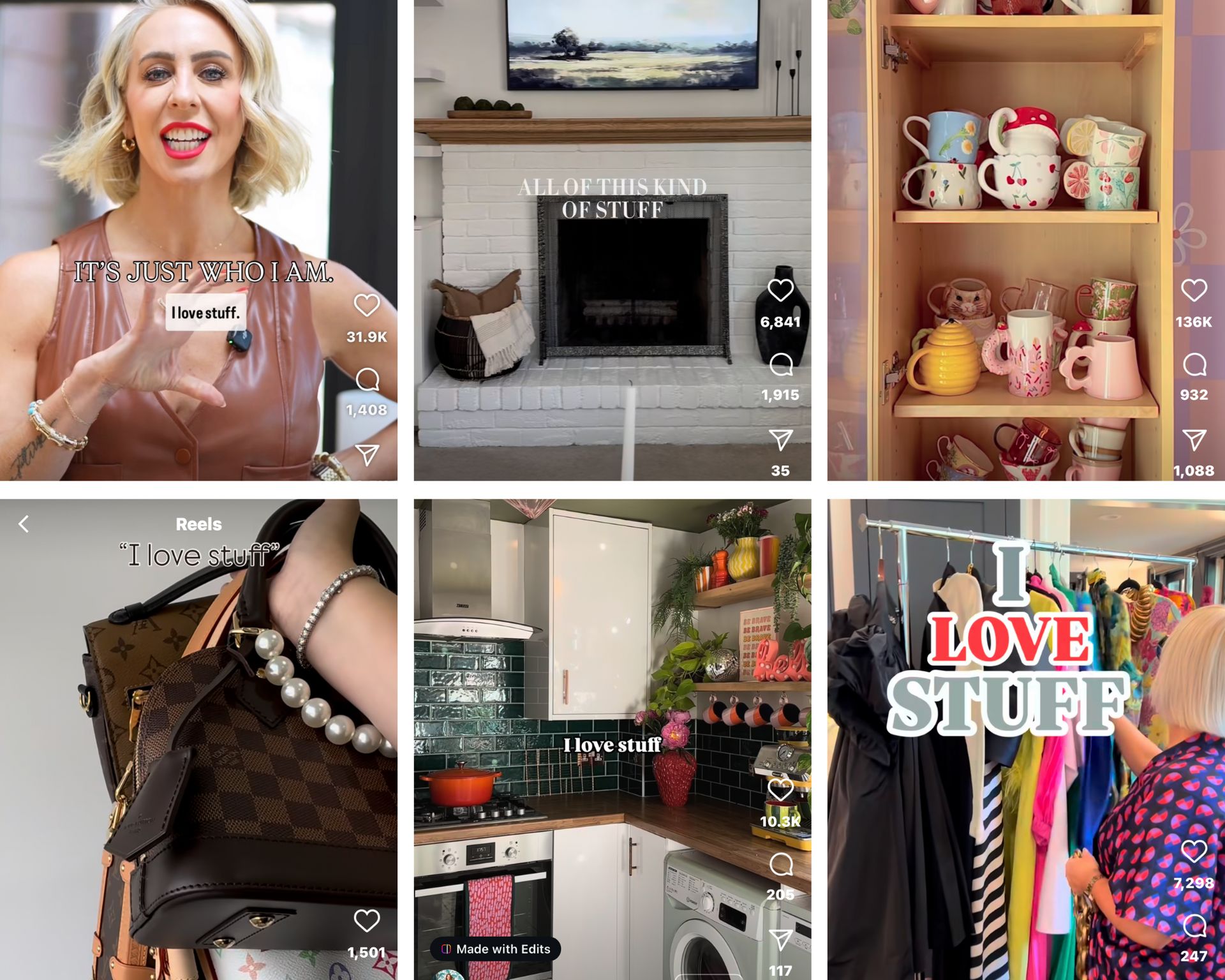 The original video and audio is by an interior designer who states she’ll never give up on the delusion that someday she’ll become a minimalist. There are over 20k other Reels using the audio. There’s videos with closets full of clothes, collections of bags, cupboards filled to the brim, impeccably decorated interiors, and young girls showing off their hoards of beauty products.