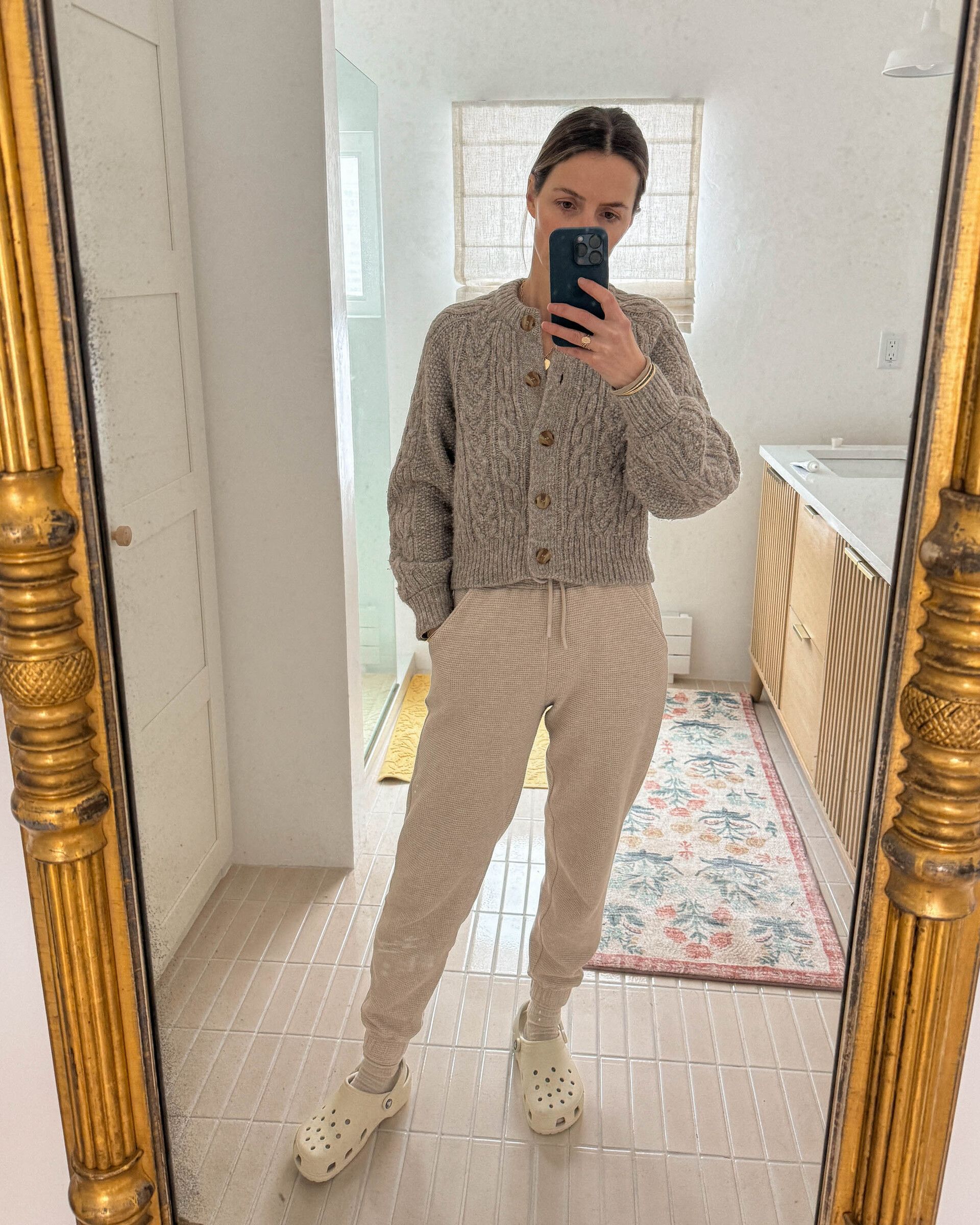 Wearing: Faherty Cardigan, Negative Sweatpants, Crocs